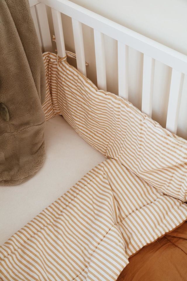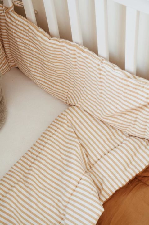 De algodón rayado grueso en color visón, mostaza y terracota, reversible con algodón liso en color blanco (sin ser el mostaza que es reversible, color mostaza) y relleno con guata (rayas de 1 m de largo).